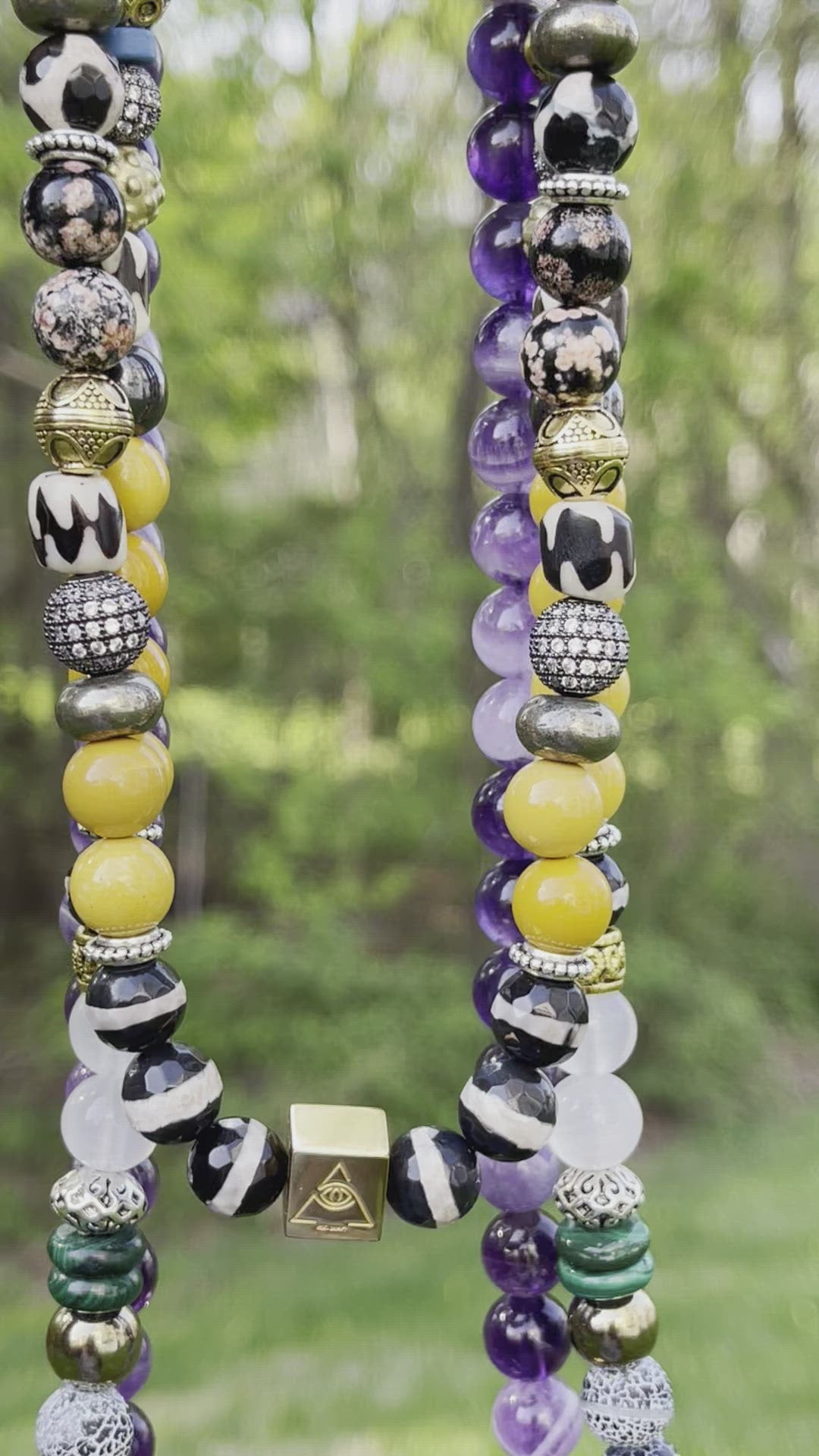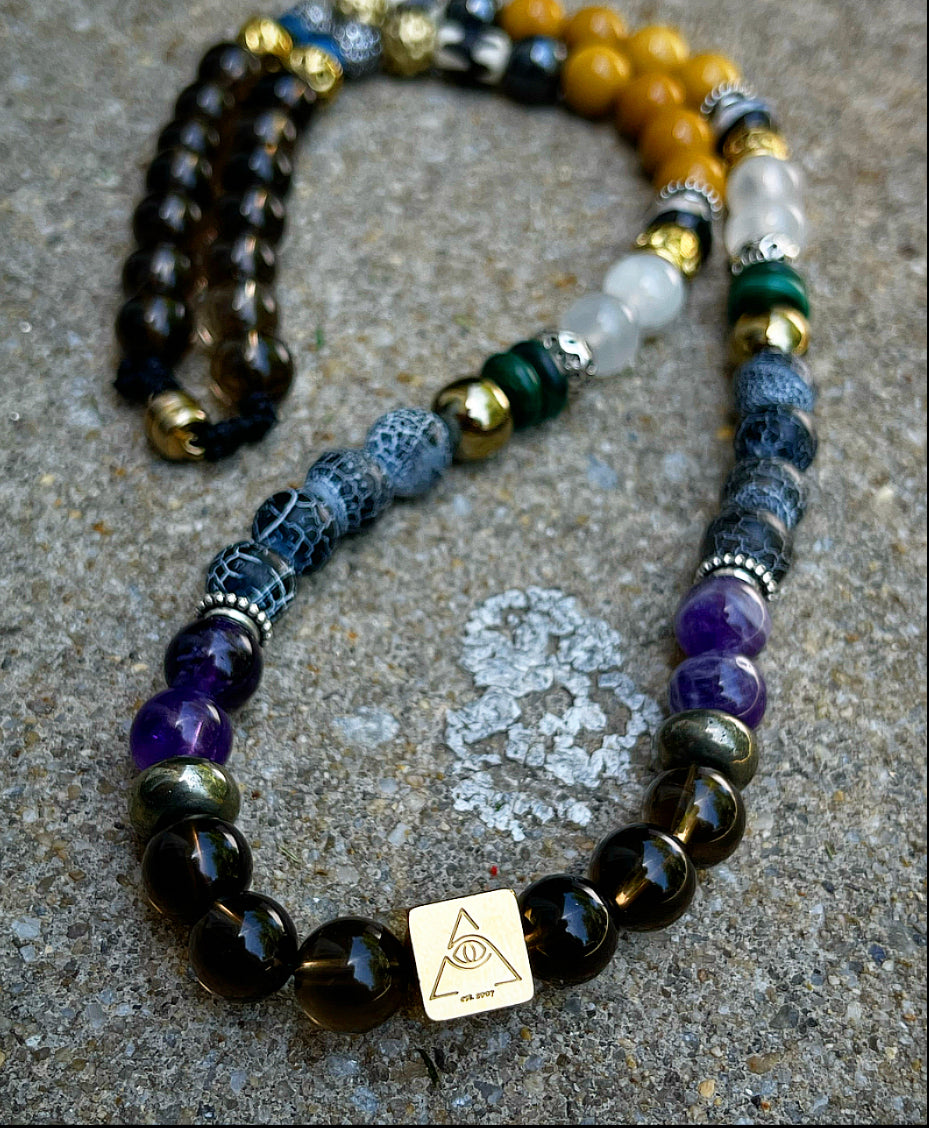 We are pleased to welcome a new staple to the collection. Handcrafted with natural stones in a harmonious sequence, the timeless Neckpeace is reinforced with a durable nylon thread and finished with a magnetic closure for easy wear. Stainless steel, tarnish free Eye of Peace charm.